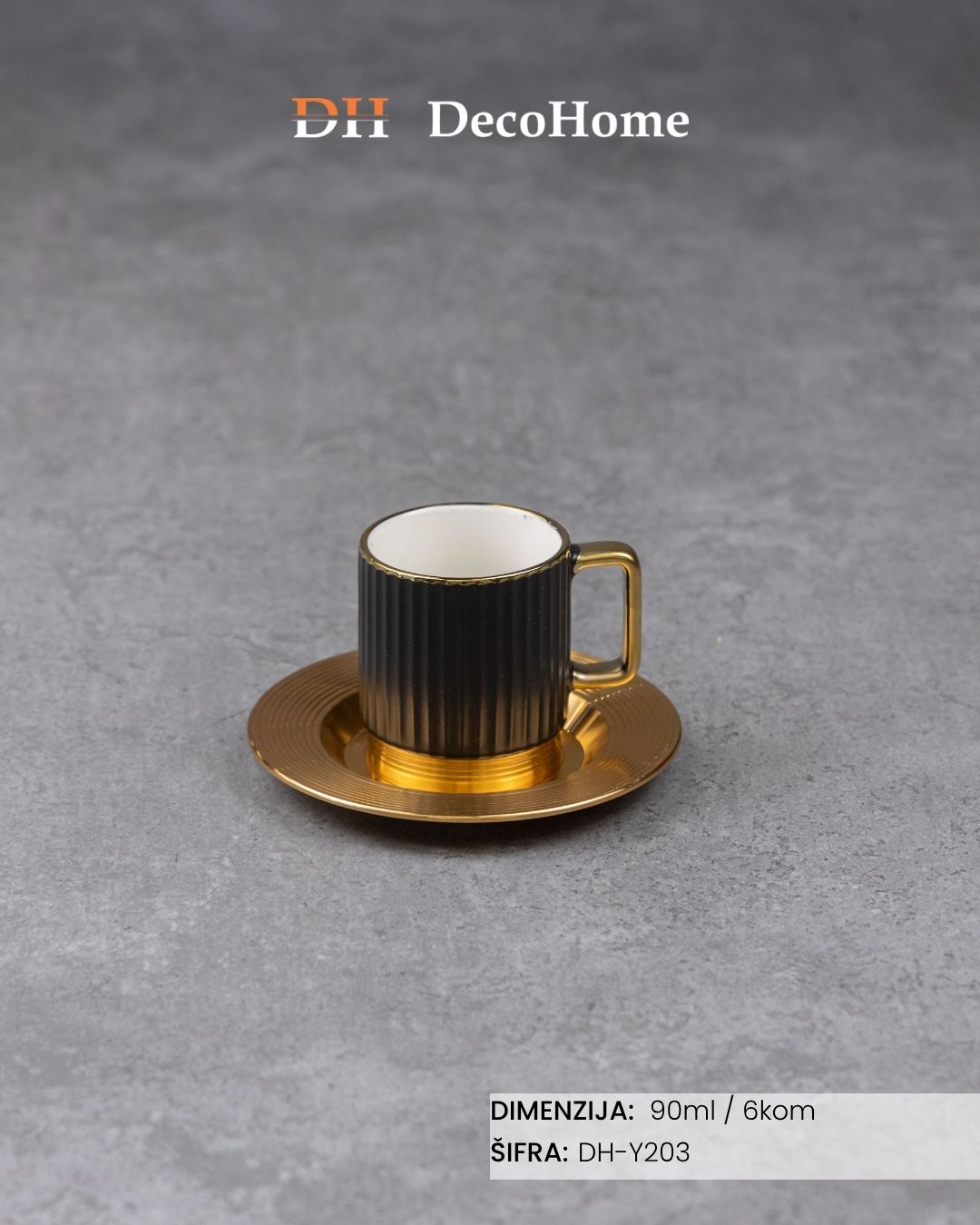Porcelanske crne šolje + aluminijumske zlatne tacne 90ml / 6kom - DH-Y203